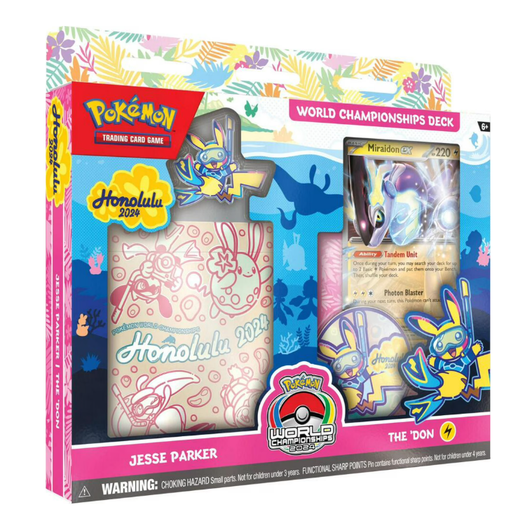 Grab a World Championships deck and play like a champion! Choose one of four powerful decks, each a card-for-card replica of an actual title-contender’s deck from the 2024 Pokémon Trading Card Game World Championships in Honolulu!